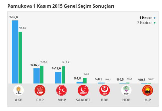AKP; CHP,MHP, Saadet Partisinden, HDP den, DP den, DSP den ve BTP den aldığı oylar dışında sandığa yeni gelen 494 seçmenden daha oy alarak 7 Haziranda % 54,56 olan aldığı 9654 oyunu 1 Kasımda %67 ye çıkarak 12,051 oya çıkardı.