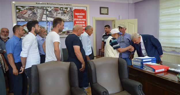 Bayramlaşma programında Pamukova Belediye Başkanı Cevat KESER, çocuklara bayram harçlığı dağıtırken, bazı vatandaşların da sorunlarını dinleyerek ilgilenilmesi için belediyemizin ilgili birim amirlerine talimat verdi. Sanki seçim atmosferine girilmiş gibi bir havada gerçekleşen bayramlaşma programında vatandaşların Başkan KESER’e yönelik yoğun tezahüratları dikkatlerden kaçmadı. Vatandaşlar belediye binasını hep bir ağızdan söyledikleri “En Büyük Başkan Bizim Başkan, Pamukova Seninle Gurur Duyuyor, Durma İlerle Pamukova Seninle” sloganlarıyla inlettiler. Başkan KESER’de onlara “Önce ALLAH’ın izni, sonra Cumhurbaşkanımız, Genelbaşkanımız Sn.Recep Tayyip ERDOĞAN’ın tasvipleri ve sizlerin bu eşsiz güven ve desteği ile 2019 belediye seçimlerinde yine birlikteyiz inşallah” dedi.